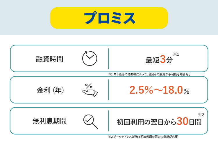 | プロミス | 1~800万円 | 2.5%~18.0% | 1,000円~ | 最大30日間 |