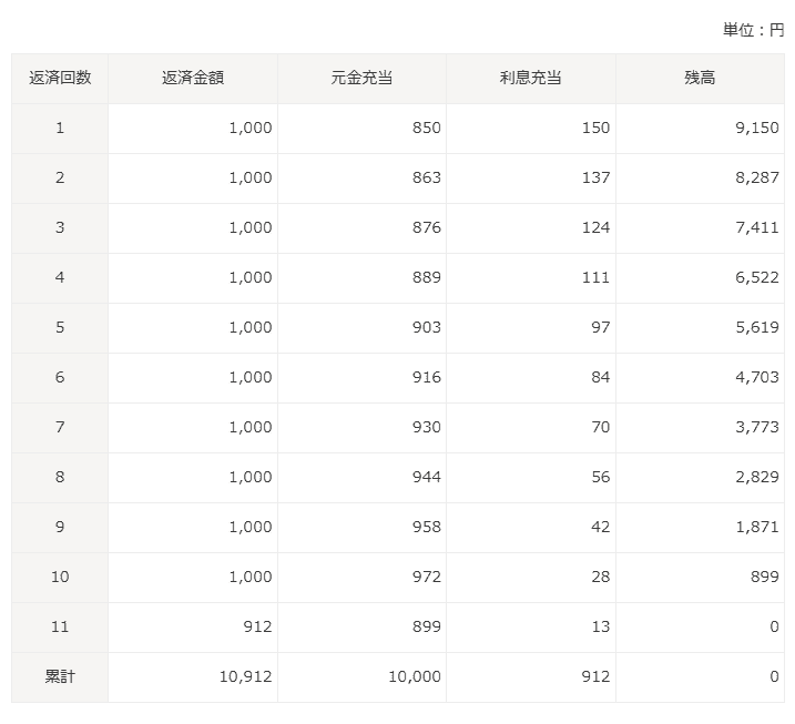 1万円を1,000円ずつ返済するため返済期間は11ヶ月で、最終的に支払う利息は912円です。