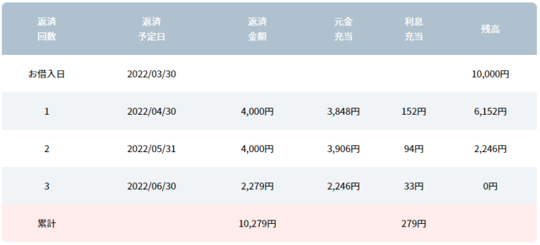 アイフルの場合は、1万円を3ヶ月かけて返済して最終的に支払利息はたった279円のみ。